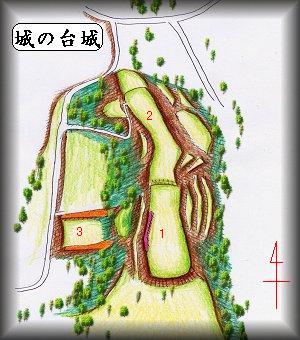 城は基本的にこれだけであり、城主がいざというときに立て籠もるための、単純な構造の詰めの城であったというように思われる。先にも述べたが、台地下の3の部分の周囲には土塁や切岸が存在している。これらの部分は、現状ではかなり改変を受けているようにも見えるが、かなり独立した区画性を保っている。