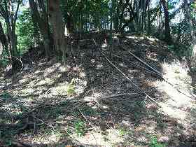 | 台地基部とを分断する堀切。深さ4m、幅6mほど。 | 1郭南側の虎口付近の土塁。高さ2mほどである。 |