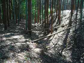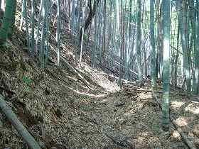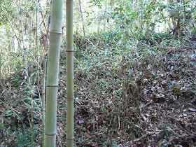 | 城のある台地の先端部。比高20mほどの台地で、先端は削られている。 | 2郭の城塁。しかし、これも遺構というよりも、台地を削り取られた時の名残であるかもしれない。 |