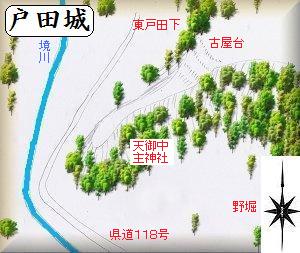 戸田城は、金剛勝寺の南600mの位置、西側に突き出した比高20mほどの台地先端部にあり、南側の中腹に天御中主神社が祭られている。