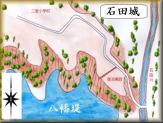 八幡堤を挟んで、河原田城のすぐ北側に位置している。河原田城の周囲には、家臣団が居住したと思われる支城がいくつも存在しているが、中でも最も近い位置にあるのが石田城である。