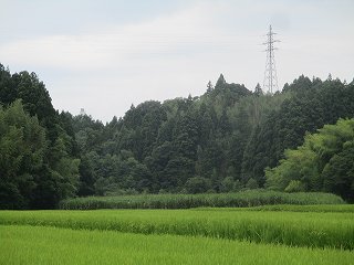 | 南方から遠望する神田城。鉄塔が建てられているのが目印となる。 | 台地に進入してすぐにある1本目の鉄塔。 |