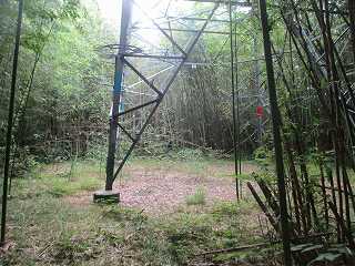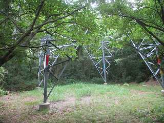 | ヤブの中を道が続いている。 | 2本目の鉄塔があるところが城内。 |