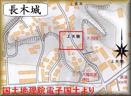 遺跡の印が付いているのは、八幡若宮神社の背後の台地の中間部辺りであるが、ここに城館が存在していたのであろうか。