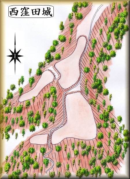 右の鳥瞰図は、上記の書の図に基づいて描いてみたものである。山頂を削平していくつかの郭を造成し、郭と郭との間を堀切で区画していたようである。