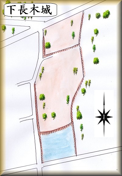 下長木城は、ホームセンタームサシのすぐ東側の比高3mほどの低位段丘上にあった。70m×35mほどの郭がメインでで、宅地や畑地となってかなり改変されている。