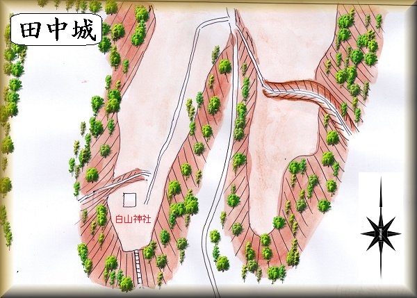 2つの細長い台地が南側に向かって延びているが、このうち東側の部分が田中城と呼ばれるところである。