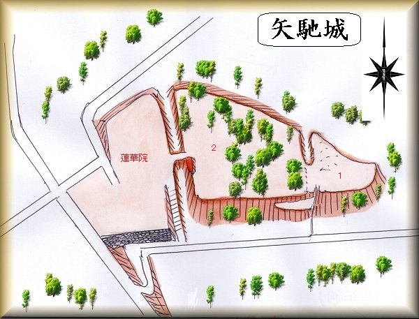 蓮華院のj東側の、側の比高20mほどの台地先端部。段丘上に複数の郭が残るという。