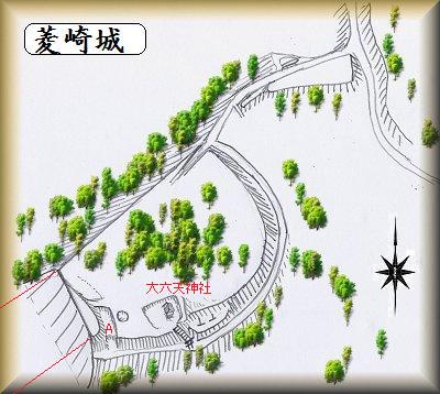 大根氏館、菱崎城、長山城の3城は矢作城(大崎城)のすぐ東側にあり、いずれも矢作城の支城にあたると思われる。写真の菱崎城は、矢作城の600mほど東南にあり、この東北400mに大根氏館、南600mに長山城がある。