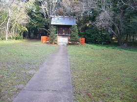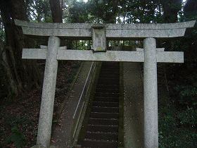 | 西側から見た山崎城。比高20mほどの台地の北側先端部にある。 | 西側下から神社への参道が付いている。しかし、この虎口は後世の改変によるものであろう。 |