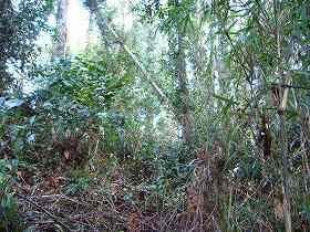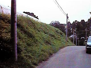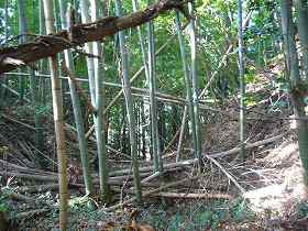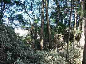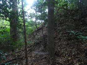 | 側高神社の脇の土塁。高さ4mほどもあり、かなり大規模である。 | 南側の櫓台Aの先の堀切。深さ6mほど。Aの部分は実にしっかりとした櫓台となっている。 |