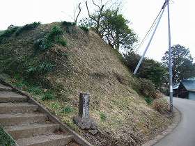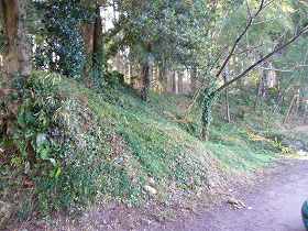 | 大六天神社の鳥居と石段。ここまで来る道が分かりにくい。 | Aの堀跡と城塁。わずかに残された遺構である。 |