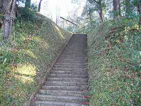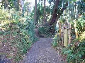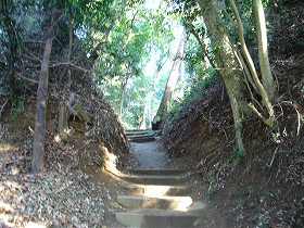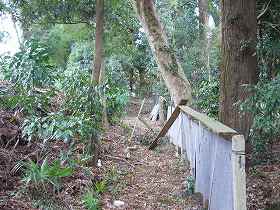 | 1郭にある護国神社。郭内はきれいに整地されているが、それゆえに改変も行われているであろう。 | 西側先端下から護国神社に上がる石段。腰曲輪からの城塁の高さは8mほどある。しかし、これは本来の虎口ではなかったと思う。 |
