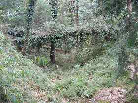 | 1郭東側の下の隣の民家との間には、堀跡らしき痕跡が残る。 | 1郭皆川の横堀。深さ3m、幅5mほどである。 |