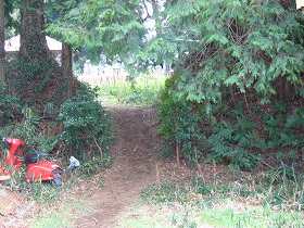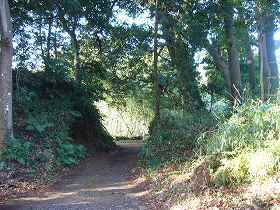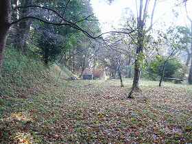 | 要石のところに上がる切り通し部分。 | その東側の虎口。右側の土塁が手前に張り出しているが、改変も激しく旧状は不明である。 |