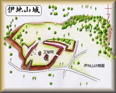 伊地山の正智院が城址である。正智院は現在では無住のお寺となっているが、その周囲には土塁や空堀が見られ、北側の土手は、かなり鋭い城塁のように見える。