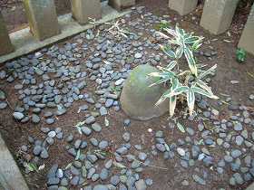 | 1郭下の腰曲輪。この右下は高さ10mほどの切岸となっている。下にはおみやげ屋さんが立ち並んでいる。 | 1郭の北西端にある要石。一見小さな石に見えるが、下側に大きく広がっており、とても掘り出すことができないものであるという。 |