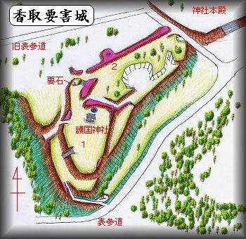 | (以前の記述) 香取要害城は香取神宮の境内の中にある。要石や奥の宮のある台地の東側の高台が城址であったという。この部分は参道より10mほど高くなっており、上は平坦な郭になっている。 土塁、空堀、腰曲輪、櫓台、虎口などが残されているという。どういう由来のある城なのか明らかではないが、香取神宮と何らかの関係があったものだろう。 |