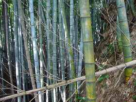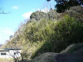 | 第2中学校の東南側の削られた城塁。比高20mほどである。 | 下の墓地から上がる虎口、上がった所が横堀となり、その先に1郭の城塁が見えている。 |