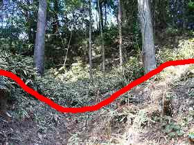 | 1郭西側虎口脇の横堀と土塁の名残。堀と土塁はこの部分までしかない。後世、埋められたものであろう。 | 1郭西側の虎口。手前は本来は堀であったのだろう。 |