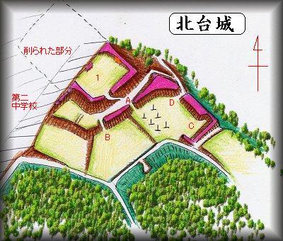 ・・・・といったようなこともあって判断に迷ってしまうのであるが、とりあえずの結論として、Cの土塁のように見える部分というのは、畑地造成に伴って削られたものであり、遺構と見ないほうがよさそうだ、ということになろうか。つまり北台城は単郭に横堀を巡らせただけの、単純だが戦闘的な砦といったようにみるのが、当たっているように思われるのである。