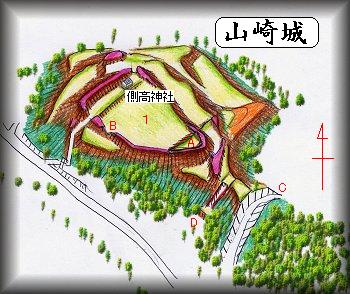 山崎城は香取神宮のある台地と北東側に向かい合っている台地の北側先端部にある。比高20mほどの台地である。JR香取駅の南800mほどの所にあり、郭内には側高神社が祭られている。