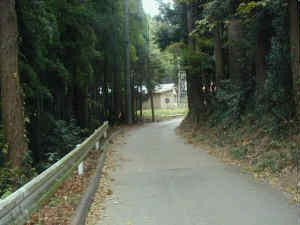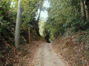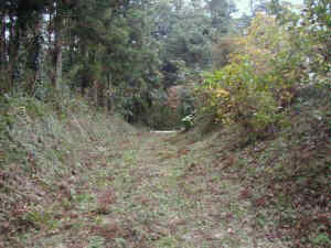この道の左手に見える山林の奥には、この写真からでは分からないが、土塁がある。高さ5,6mほどの大規模なもので、なぜか土塁の手前側が空堀のように深くなっている。