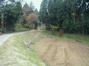幅は50mほど。この堀は右側に向かってだんだん深くなっていき、最終的には深さ20mの沢となり、上の写真の虎口のところまで続いているのである。この写真の手前側は墓地になっており、やはり、一段高くなっている。この堀は自然地形を利用したものだろうが、かなり人工的に整形されたあとがみえ、この辺りはかなり大きな工事が行われたように見える。(だがひょっとすると堀と見えるのは錯覚で、畑地を造るために造成されただけなのかもしれない)