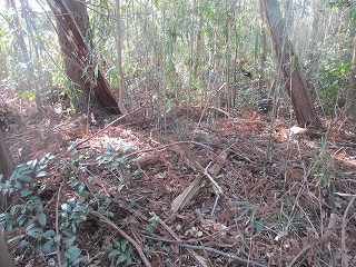 ということで真下から急斜面をよじ登る。そして上がってみるが、そこは郭ではなかった。ただの尾根の先にしか過ぎない。ということは遺構はこの先か、と思って進む。