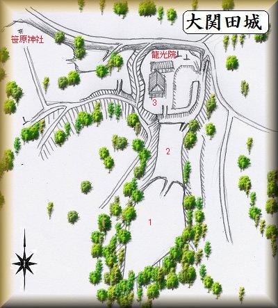 私がざっと見た印象では、台地先端部近くは城域ではないと思う。なるほど、平坦地は続いてはいるが、龍光院に見られたような土塁や空堀は見られない。両脇の斜面も、龍光院付近は切岸のようになっているが、龍光院から先は加工の跡が見られない。特に先端近くは、斜面が緩やかに下がっており、とても郭とは思えないのである。もし、このあたりも郭と見るならば、未完成の、築造途中のものとしかいえないだろうと思う。よって、大関田城は、龍光院のある地にあった単郭の居館の跡であるというように考える。