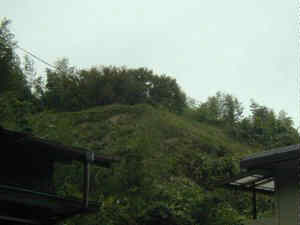 右の写真は山田地区に上ってくる途中の城塁のような土手である。この上には民家などがあるスペースがあり、その西側が土塁をめぐらせた主郭となる。この道のある低地は幅30mほどで、写真の右側も土手となっている。つまり、ここも大きな横堀のような形をしているのである。ほとんどは自然地形のままであると思うのだが、それでも、土手は加工されているようでもあり、横堀といってよいだろう。