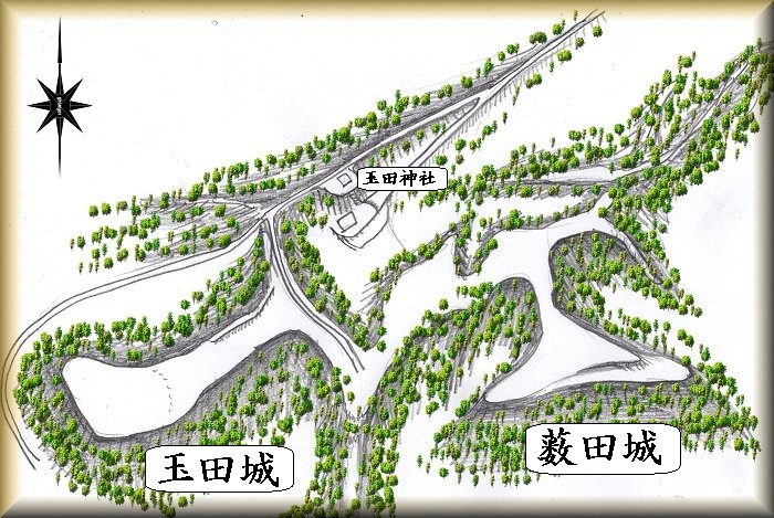 玉田城は、玉田神社のある台地上にあった。この台地は南西側に3ヶ所ほどの突出部を持つが、その北側の先端部に玉田神社(下に神社の赤い鳥居が見える)、そして中央の舌状部が薮田城の跡である。この台地の東側の中央部(玉田城の東北500mほど)には薮田城がある。