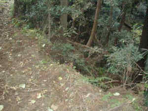 どうやら、中心部を高速が削ってしまったので、遺構らしきものは湮滅してしまったものと思われる。途中に沢があり、天然の空堀のように見えるのだが、遺構であるとも思えない。ただ、橋の南側の深い沢沿いにある写真の道が、土橋のような形状をしているのが気になった。下は深さ20m近い沢で、斜面は削りたてたような急斜面である。ただし、自然地形に過ぎない可能性もある。