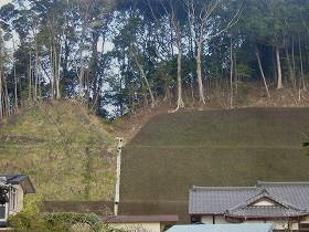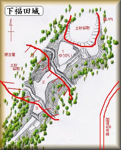 下福田城は大部分削られてしまっているのだが、新たに急斜面の防護工事が行われて、さらに斜面が削られた。ところが、そのために、以前は見えなかった堀切が近くの国道409号からでも見えるようになっている(2009年3月)