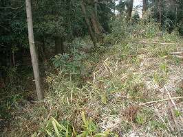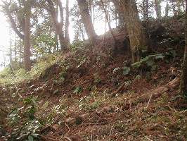 | 2郭下の腰曲輪から見た城塁。確かに切岸加工されている。 | 尾根上にある切り通し。竪土塁が2本並んでいるような構造で、両者の間の窪みは堀切というよりは通路といった感じである。 |