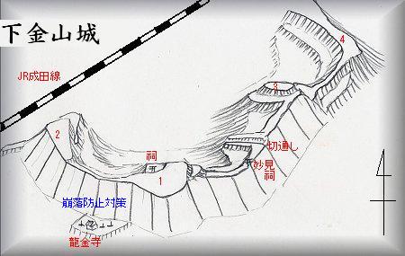 イオン成田から根木名川を隔ててすぐ北側に見える比高15mほどの台地上が下金山城であるという。急傾斜の台地であるため南側はほぼ全面に渡って崩落対策工事が施されている。従ってこちら側から登るのは難しい。妙見社やいくつかの祠に上がるための石段などはあるのだが、これを通るためにはどこかのお宅の庭先を通らせていただかなければならない。ただし台地の背後の水田地帯からならどこからでも上がることはできる。城のある台地は単純に細長く鋭く延びているだけなので崩れやすい尾根一本になっている所も多い。このような台地は、大雨でも降ればいつ崩れてしまうかも知れず、地元の人にとって見れば、すぐにでも根こそぎ削ってしまいたいところであろう。