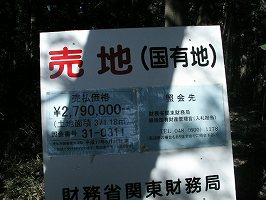 | 西側からグランド越に見た小森城。下からの比高は10m余りである。 | なんと!城址が売地になっていた。(05.3..20) それにしてもこの広さでこの値段! かなりお買い得である。買っちゃおうかな・・・・。 |