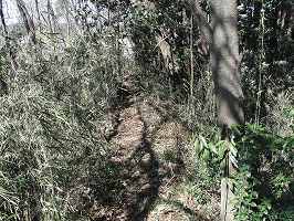 | 北側の虎口付近にある櫓台は稲荷神社となっている。 | 2郭東側の堀と土塁跡であるが、高さ1mほどと、かなり低くなってしまっている。 |