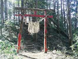 1郭の北東の隅には一段高い櫓台がある。方6mほどの規模で、ここには現在稲荷社が祭られており、下にある赤い鳥居がよく目立っている。こちら側にはもともと虎口があったようで、現在も下の腰曲輪の脇を通って台地下に続く道が残っている。