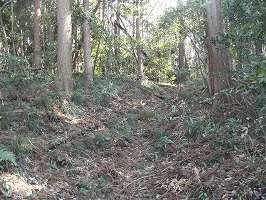 | 1郭南側の土塁と堀。深さ3mほどあり、最もよく遺構が残っている部分。 | 1郭西側の土塁。高さ3mほどある。 |