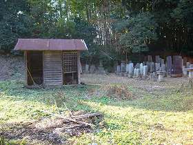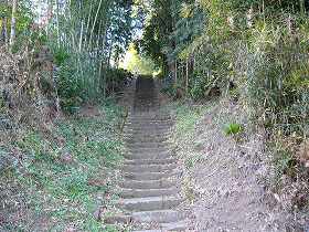| 城に登れる場所は1ケ所しかない。それが東側のこの石段を上がる道である。 | 上がった所が平坦地になり、墓地に利用されている。正面奥に土手が見えるが、これが本来の城塁である。 |