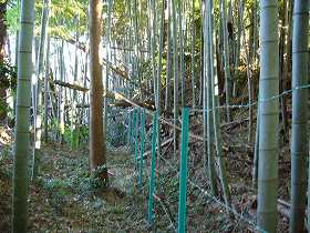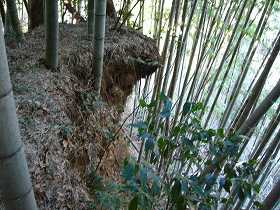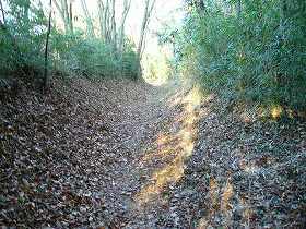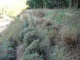 | 台地北側はこのような見事な城塁状になっている。重機によって削り取られたものだろうか。 | Cの通路は堀底道のようにも見える。ここが一番遺構らしい部分である。 |