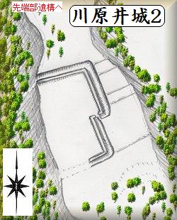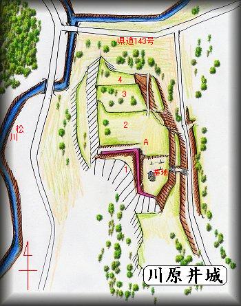 場所は川原井城の北東800mほどの所で、熊野神社と東南に向かい合っている比高20mほどの広大な台地上である。この辺りから台地の南側下の宅地に入っていける橋があるので、これを渡って進むとすぐに左手に台地に上がっていける道が見えてくる。ここを進めばすぐに畑地となっている台地に到達する事ができる。周囲の斜面は非常に急峻なので、この道以外の所から台地に上がるのはとても難しいものと思われる。