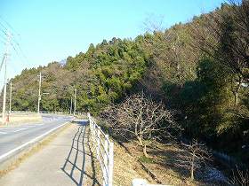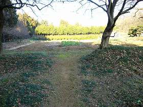 | 西側から見た里見城。比高20mほどのかなり広大な台地である。 | 城の入口には低い土塁と虎口があるが、これはあまり遺構らしくは見えない。 |