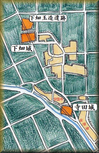 下畑城は畑野と金井を結ぶ金畑線の途中、下畑集落の北西端辺りにあった。しかし、大規模耕地整理が行われたために、現在では遺構は消滅している。しかし、地元には「はざまの城」が存在していたという伝承が残っている。