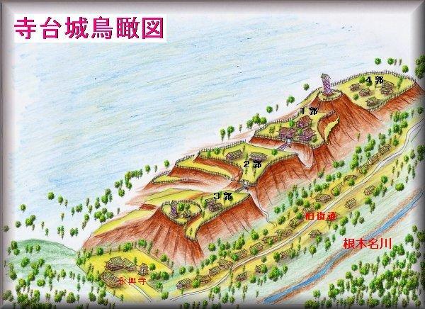寺台城を南西上空から鳥瞰した図である。一番北の4郭は、現在は農協会館となっており、ほぼ消滅してしまっている。その南の円形の郭が最高所で、ここに城址碑が建っている。