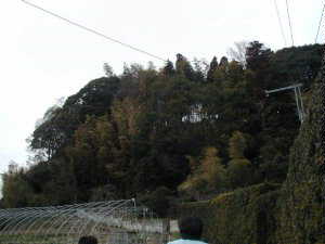 これが1郭の遠望。1郭は畑地になっている。台地の比高は20mほどだが、この台地は岩盤の上にできたものらしく、あちこちに岩がむき出しになっている。まさに要害!