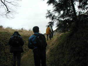 2郭の北側には写真の(く)の土塁がある。人がいるので、その高さがよくわかる。高さは1,5mほどとそれほどでもないが、その向こう側にも空堀があり、二重構造となっている。この空堀を越えて進むといよいよ3郭である。
