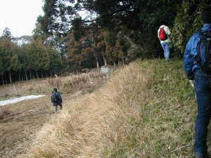 さて、今回はどうして降りるか、ということなのだが、なんと、先端部から降りてみようと言うのである。まったく、この人たちって。。。。。。。というわけで、先端部の藪と土手を直滑降に下っていったのであった。ちなみに、この先端部下は墓地になっている。
