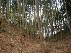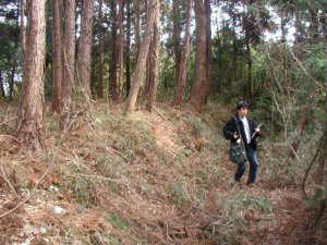 4郭先端部近く。先端の方から西側を見たところ。奥の方の杉林が2郭である。注意してみると、人が立っている辺りは左側より1mほど高くなっているのが分かるだろうか。この、人が立っているところが(け)の土壇である。長さ20mほどもあり、かなり大きいものである。かつてこの郭に星宮神社が建っていたと言うが、それはこの土壇の上だったのではなかろうか。ちなみに、この写真の左手先の台地先端部に鳥居だけが残されている。この鳥居の下から、下の民家を通って台地下に降りていく道もある。